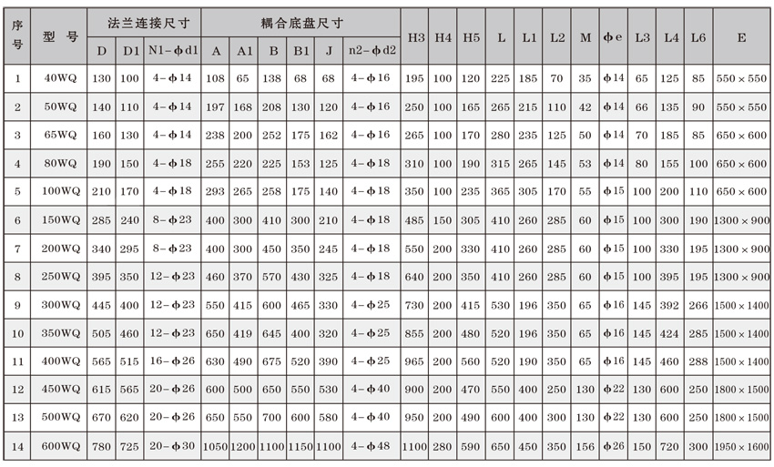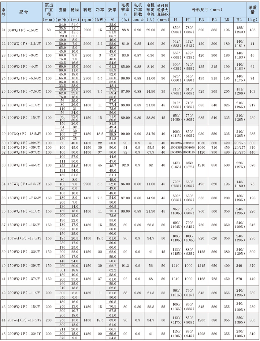 為了使WQ(F/JY)系列潛水污水泵以更好的可靠性、更高的機(jī)組效率服務(wù)于客戶,在總結(jié)25年生產(chǎn)制造該系列泵的經(jīng)驗(yàn)積累的基礎(chǔ)上,再一次更新優(yōu)化了水力模型,創(chuàng)新機(jī)械密封、軸承結(jié)構(gòu),采用優(yōu)質(zhì)電機(jī)材料,根據(jù)使用環(huán)境條件,18.5kW及以上泵對(duì)電機(jī)循環(huán)冷卻,保證可靠性。全系列共111個(gè)基本規(guī)格,通過使用原型葉輪和改型葉輪及其切割,在型譜性能范圍內(nèi),可提供恰當(dāng)滿足用戶所需要的任意流量、揚(yáng)程工作點(diǎn)的水泵。