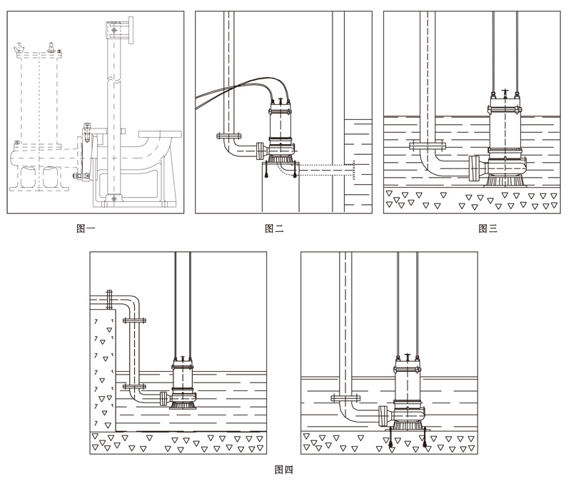 2、最低運(yùn)行液位:見安裝尺寸圖(無電機(jī)冷卻系統(tǒng)),有電機(jī)冷卻系統(tǒng)時(shí),水位只要保證泵能正常輸水;