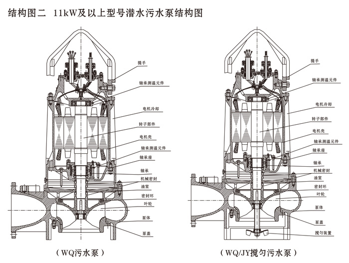 7、機(jī)組獨(dú)特冷卻系統(tǒng),使泵在露出液面或干式安裝時(shí)能安全可靠運(yùn)行(1.5kW及以下泵無冷卻系統(tǒng)),最大程度排送污水;泵側(cè)碳化鎢對(duì)碳化硅摩擦副,耐高溫、耐沖擊、耐磨損,電機(jī)側(cè)碳化硅石墨摩擦副,摩擦力小;